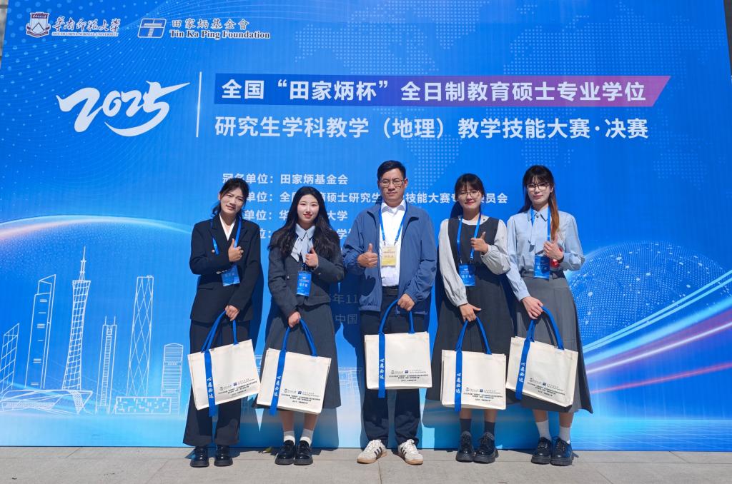 11月21日至22日,2025年全国“田家炳杯”全日制教育硕士专业学位研究生学科教学(地理)教学技能大赛决赛在华南师范大学顺利举行。经过激烈角逐,我院24级学科教学(地理)专业硕士研究生表现优异,共四人斩获佳绩。其中,徐冰同学荣获二等奖,杨艺丹、杨艳同学分获三等奖,马硕同学获得优秀教学设计奖。徐丰老师荣获优秀指导教师奖。