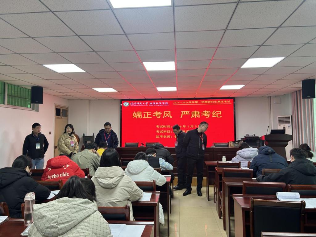 为切实加强期末考试组织管理,严肃考风考纪,我院开展2025-2026学年第一学期研究生期末考试巡考工作。1月5日,地理科学学院副院长颜俊,副书记韩勇,副院长闫军辉、潘晓芳,深入考场对研究生期末考试的各项工作进行了全面细致的巡视与督导。